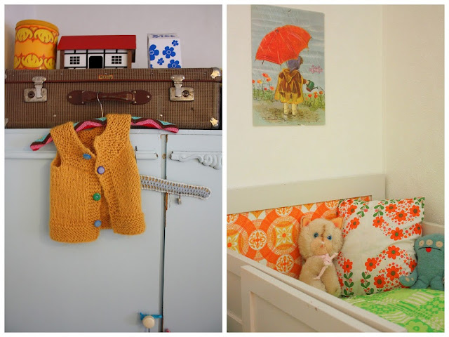Je fonds devant ce look un peu rétro de ces photos; le papier peint en tête de lit, les motifs du coussin, le orange, la vieille valise ...