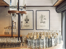 Le design du bar et le graphisme des bouteilles, sachets et autres produits dérivés ont été réalisés par l'agence Esrawe qui a crée le superbe bar mexicain "Cielito Querido Café" dont je vous ai déjà parlé ici. Dans ce bar, l'eau est recueilli ( il pleut beaucoup à Mexico ), distillée et purifiée sur place avec une méthode de purification élaborée.