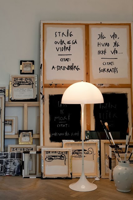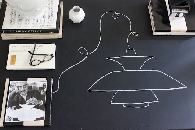 La première fois que j'avais vu les photos de son espace de travail mon oeil avait été immédiateent attiré par ses crayons et pinceaux tous striés de blanc et de noir. Aujourd'hui, mon oeil adore cette table tableau où la craie blanche a exquisé cette réplique d'une lampe Louis Poulsen.
