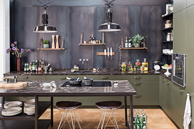 SupprimerTu as raison, cette cuisine est très belle! J'aime aussi le kaki, les étagères soutenues par du cuir, le marbre noir et les armoires à volet en bois dans le bureau/atelier... très très très très belle découverte !!!