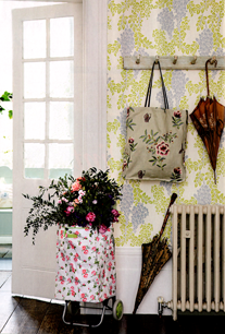 In the last stage a flowery bedhead invites for one to give a feminine touch to the set. A clear wooden bench allows of the arrangement and can welcome a beautiful wicker lamp. For the final touch a bouquet of flower calling back the colors of the bedhead...